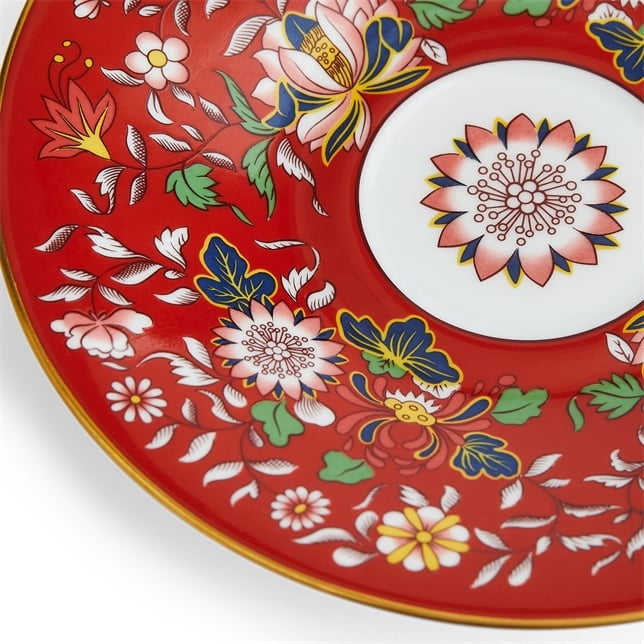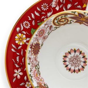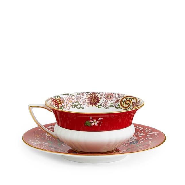 Насладитесь чашечкой ароматного чая из темно-красной чашки с блюдцем в восточном стиле. На внешней стороне чашки изображена водяная лилия на ярко-красном фоне, которая элегантно контрастирует с белым костяным фарфором. Внутреннюю поверхность чашки и блюдца украшают замысловатые растительные орнаменты, а золотая отделка придает им завершающий штрих роскоши.
