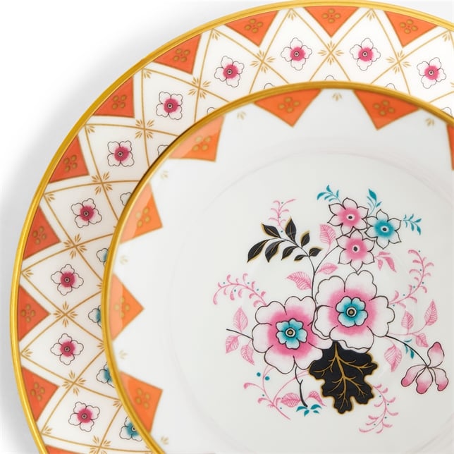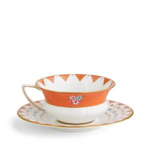 Чашка и блюдце Wonderlust Peony Diamond, сочетающие в себе теплые тона и изысканный дизайн, станут изысканным дополнением к вашему чаепитию. Блюдце украшено яркими пионами в геометрическом рисунке, а на чашке повторяется цветочный мотив. Широкая темно-оранжевая окантовка оттеняет полупрозрачный белый фарфор, а характерная золотая окантовка Wedgwood придает изделию роскошный вид.