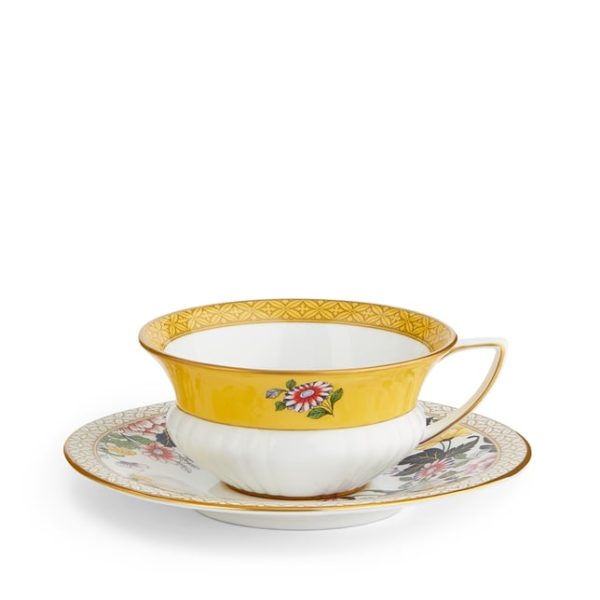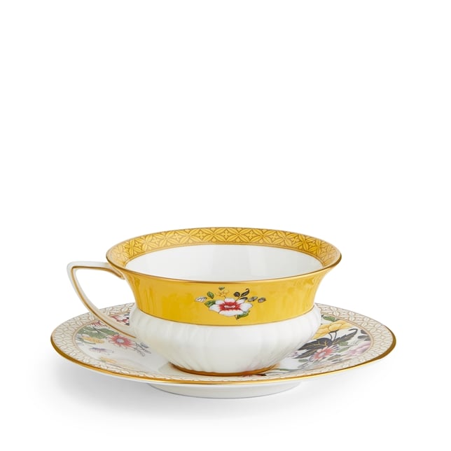 Чайная чашка с блюдцем цвета примулы из коллекции Wonderlust излучает свет и тепло независимо от погоды на улице. Белый фарфор обрамлен яркой желтой полосой с элегантным цветочным мотивом. Блюдце украшено цветами и узорами в современном традиционалистском стиле Grandmillennial, что позволяет вам ощутить свою собственную уникальность.Можно мыть в посудомоечной машине.