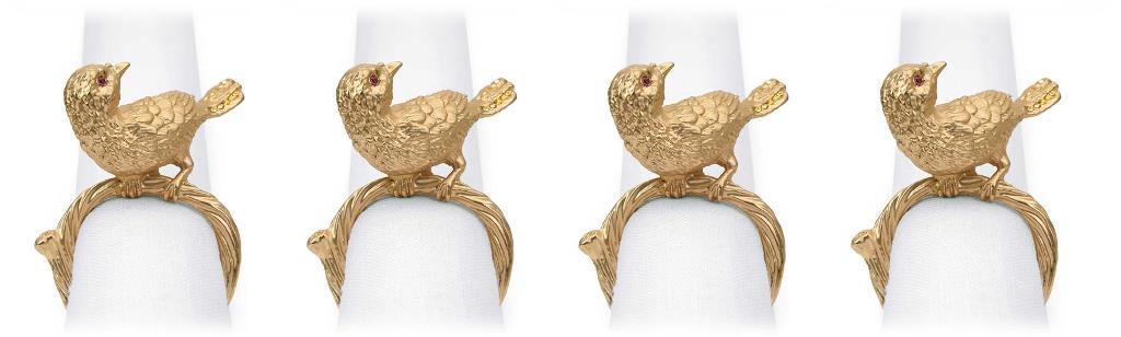 Природные мотивы — одна из излюбленных тем американского бренда L’Objet. Кольца для салфеток «Птичка» покорят ценителей необычных вещиц. Миниатюрная фигурка, изящно сидящая на тонкой веточке, декорирована 24-каратным золотом и украшена благородно мерцающими на свету кристаллами Сваровски. Мельчайшие детали филигранно проработаны: от перышек до клювика. Элегантный аксессуар станет эффектным акцентом в сервировке стола.
