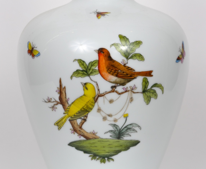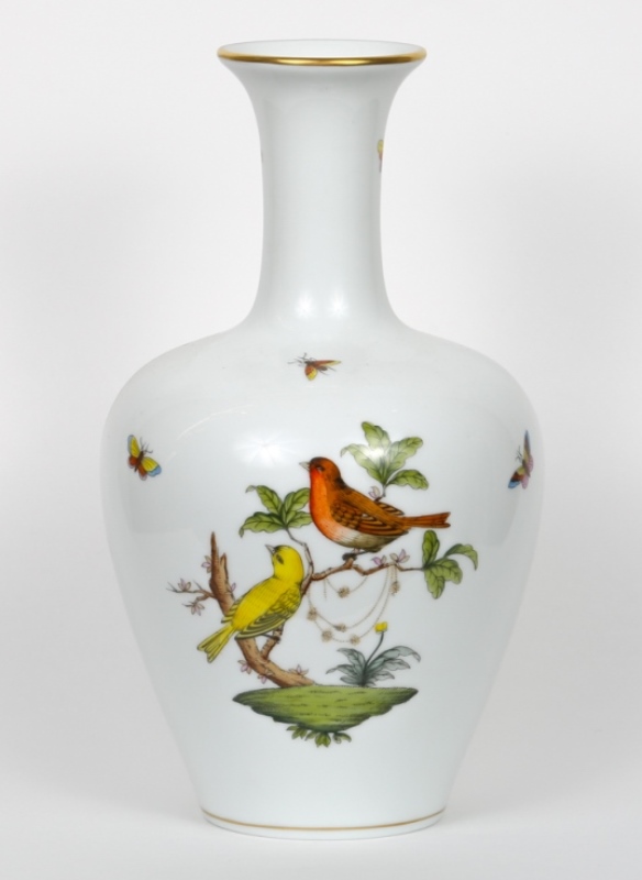 Изысканные пастельные бабочки и жуки разбросаны по 12 птичьим композициям в декоре Herend Rothschild.Легенда гласит, что однажды баронесса Ротшильд потеряла свое ценное ожерелье. Она обвинила свою горничную в краже.Но однажды, гуляя по саду, она увидела певчих птиц на дереве, а рядом с ними свое потерянное ожерелье.Мор Фишер, владелец мануфактуры,который тоже слышал эту историю, воссосоздал этот знаменитый орнамент в своем фарфоре. Семья Ротшильдов сразу же влюбилась в фарфор Herend с рисунком птиц, поэтому заказала коллекцию в 1850-х годах. Члены семьи Ротшильдов были важными покупателями и «покровителями» фарфоровой мануфактуры Herend.Коллекция была названа в честь Ротшильдов (RO) в 1861 году.